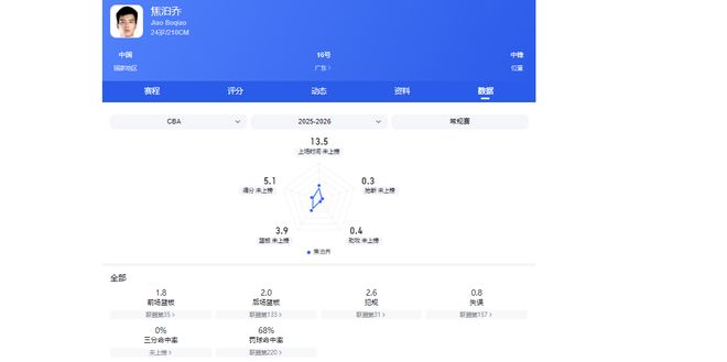 但焦泊喬在廣東隊打的并不順利,場均得分暫創(chuàng)CBA生涯新低,自身具備的空間屬性,外線投射能力也沒機會施展,只能去弧頂做擋拆順下,甚至在主教練杜鋒嚴厲的執(zhí)教風格下,球風變得有些不夠自信。