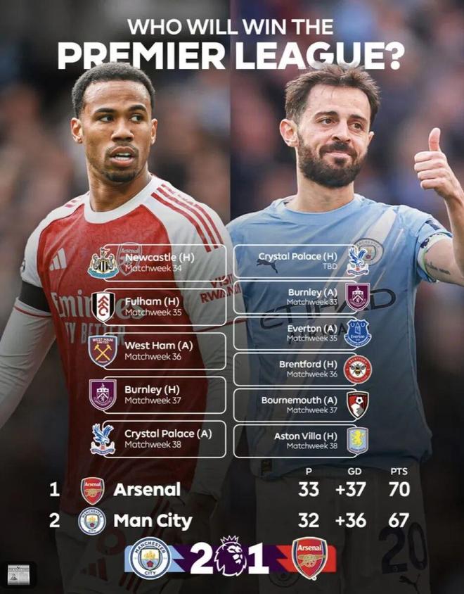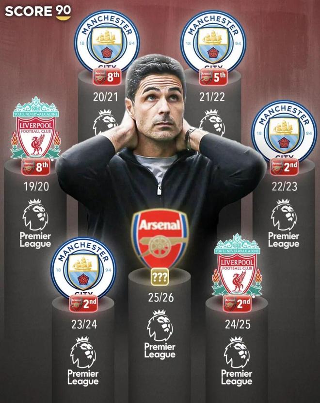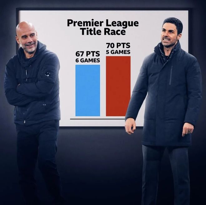 兩隊(duì)分別剩下5輪、6輪聯(lián)賽,3分的分差,如果落后的曼城最終真的逆轉(zhuǎn)奪冠,那么阿爾特塔的阿森納,將會(huì)迎來英超四連亞。