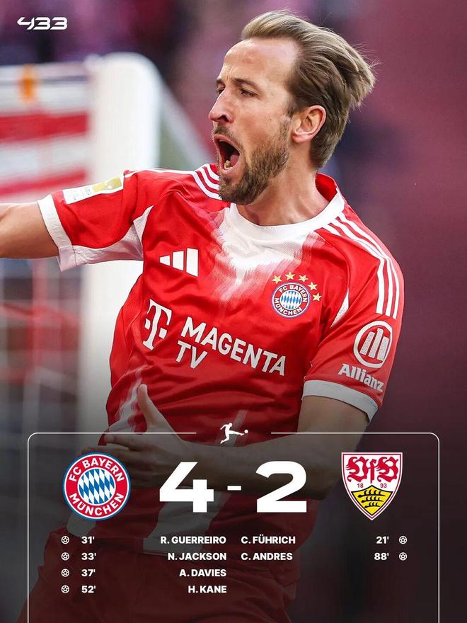 易邊再戰(zhàn),替補(bǔ)出戰(zhàn)的凱恩也取得進(jìn)球,比賽尾聲階段,斯圖加特憑借德烈斯轟出世界波扳回一球。