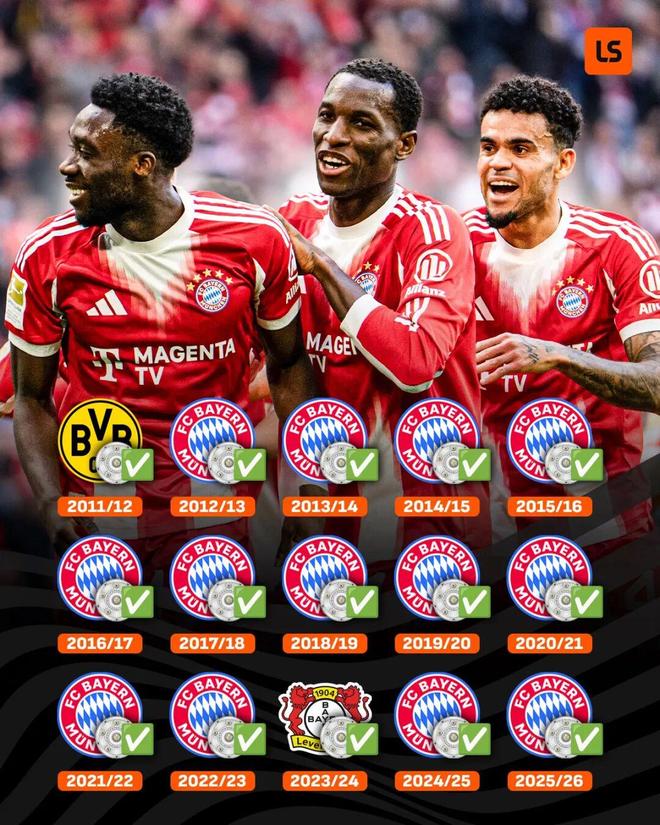 拜仁在德甲的統(tǒng)治力毋庸置疑,本賽季的聯(lián)賽冠軍,也是拜仁近13個(gè)賽季第12次奪得德甲冠軍。