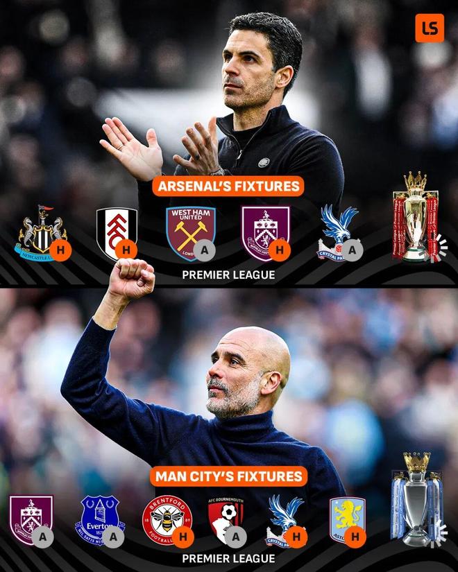 曼城本賽季聯(lián)賽的最后6個(gè)對(duì)手依次為伯恩利、埃弗頓、布倫特福德、伯恩茅斯、水晶宮、維拉。