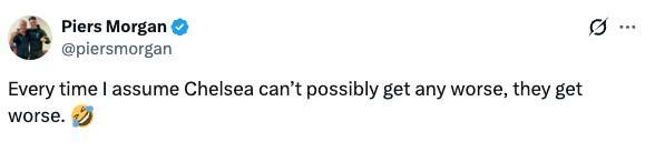 切爾西在英超第34輪客場0-3不敵布萊頓后,再次陷入輿論批評。英國電視主持人、阿森納球迷皮爾斯-摩根也在社交媒體上發(fā)文調(diào)侃藍(lán)軍。